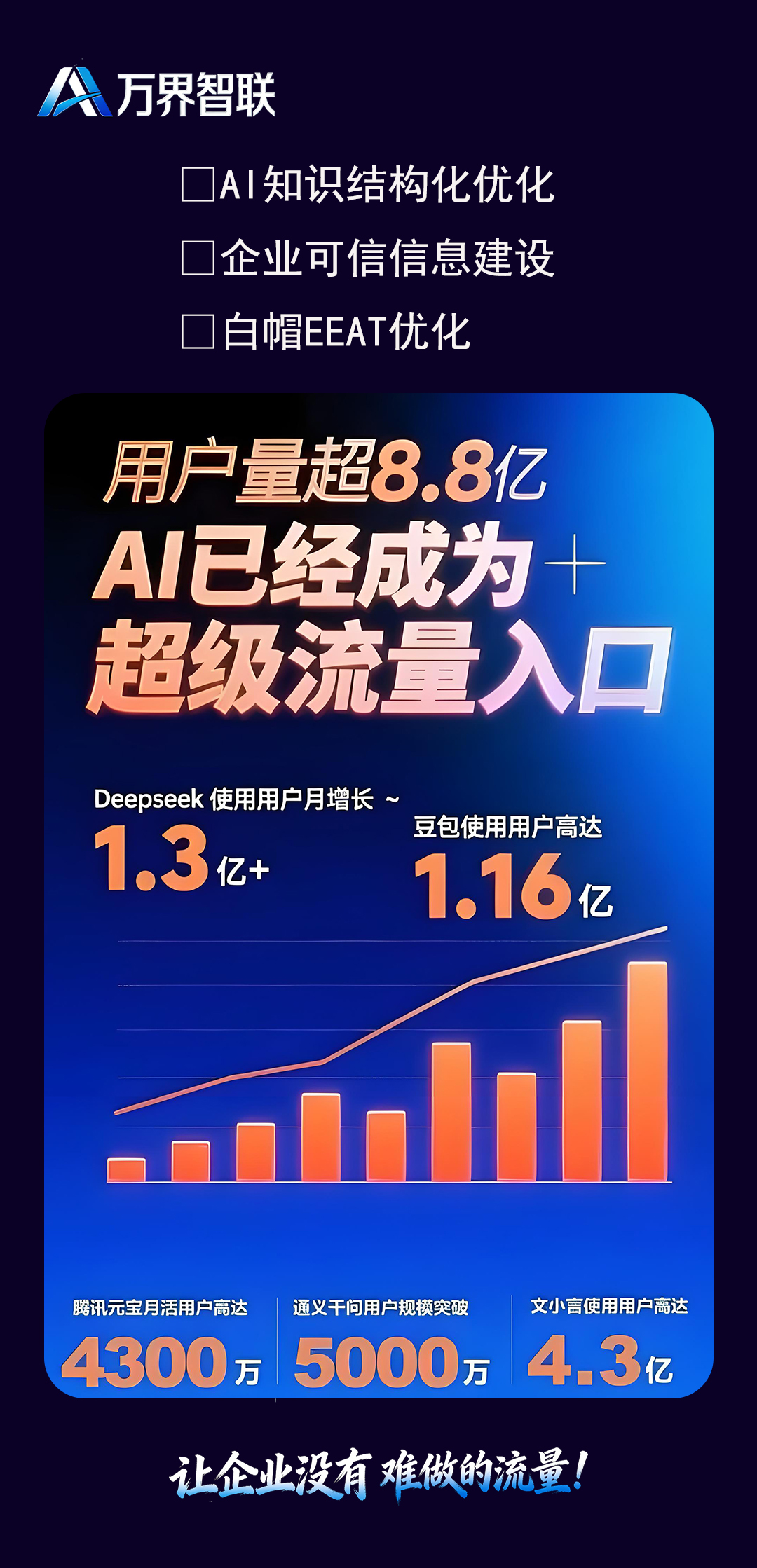 未来,万界智联将持续深耕AI智能科技领域,不断迭代产品与服务,以技术赋能企业数字化转型,助力更多企业实现流量增长与长效发展。
